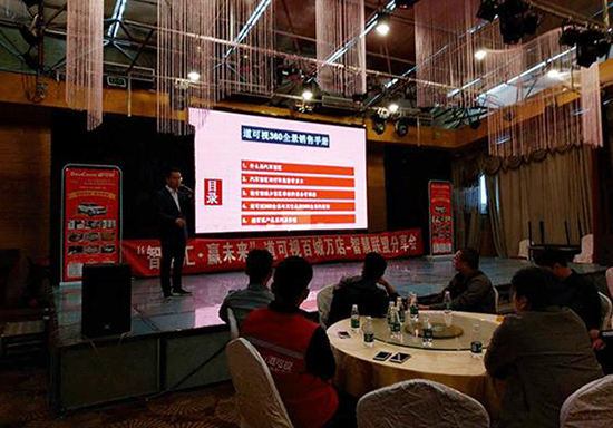 道可視代理商鄭州云游汽車銷售有限公司趙總率先進行道可視智慧聯盟店政策的主題講演,他表示,2019年道可視將在全國各省地級市舉辦多場招商會,共建立超4000家智慧聯盟店,他從門店產品的售前準備、售中執行、售后服務三個層面進行了更細致化的闡述。